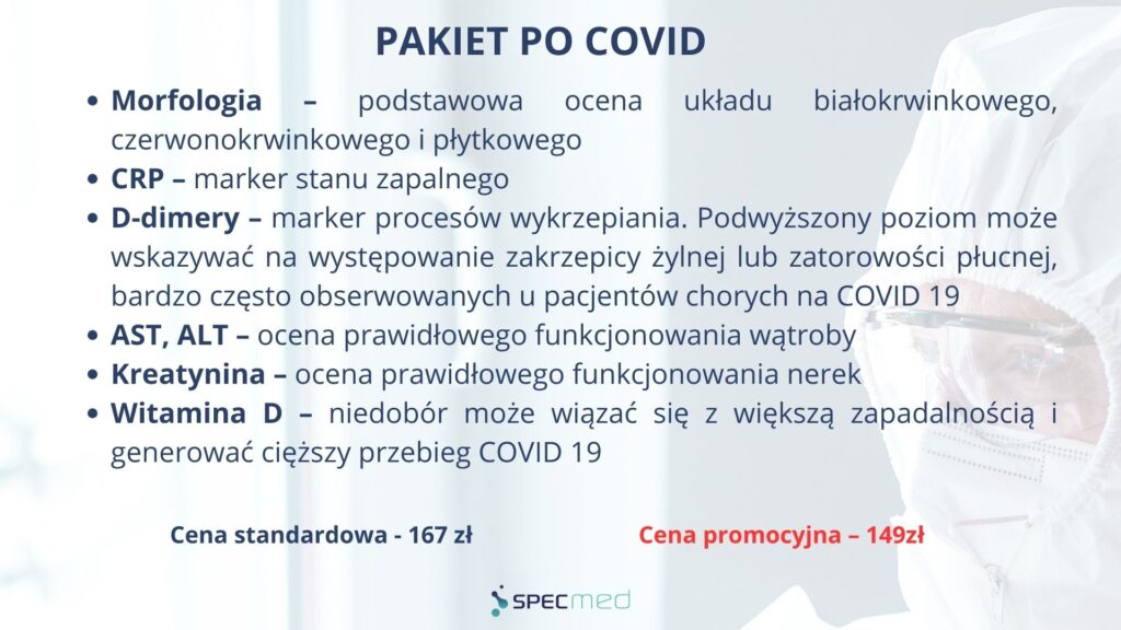 Coraz częściej opisywane są negatywne następstwa i powikłania po przejściu COVID 19. Należą do nich: zaburzenia sercowo-naczyniowe, bóle stawowo-mięśniowe, utrzymujący się kaszel, zmęczenie i zaburzenia funkcji poznawczych. Wyniki badań zawartych w pakiecie mogą pomóc w ocenie stanu zdrowia, trafnej diagnozie i wdrożeniu odpowiedniego leczenia. W skład pakietu wchodzą: